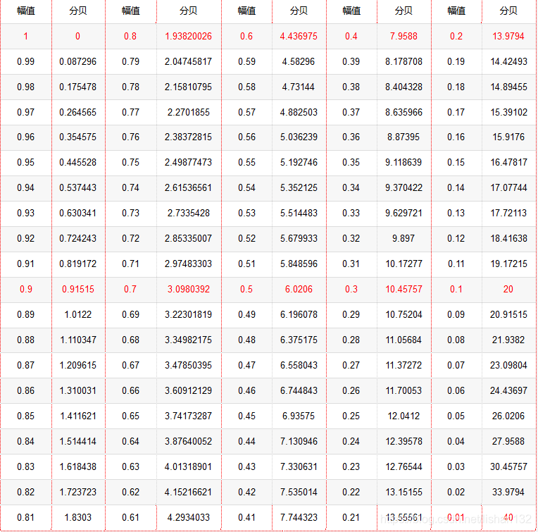 备注 :频率(f)、模拟角频率(Ω)、数字角频率(w)之间的换算:Ω=2πf,w=ΩT,w=Ω/Fs,其中,T为对模拟信号的采样周期,Fs为采样频率。分贝dB和幅度值之间的换算如下: